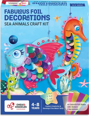 Create 3D foil art of sea animals with this fun craft kit that includes 50 colorful foil sheets, 84 foam stickers, and 4 cardboard animals.