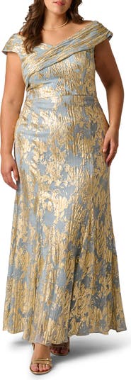 Turn heads in this textured gown designed in high-shine metallic foil with a pleated off-the-shoulder neck and graceful mermaid skirt.
