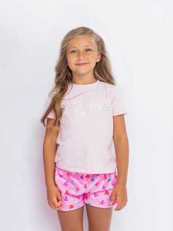 A soft, sustainable GOTS certified organic cotton t-shirt with a hugs and kisses foil prinit