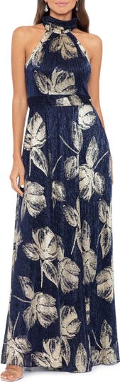 Glistening metallic shimmer emboldens this enchanting gown designed with sleek cutaway shoulders and gorgeous blooms.