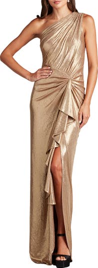 A glinting sheen elevates this statuesque shoulder-baring gown romanced by soft ruffles and finished with a leg-baring slit.