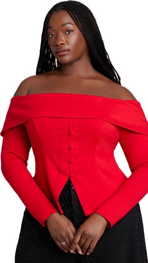 A shoulder-baring compact-knit top with a foldover neckline and refined button detail.