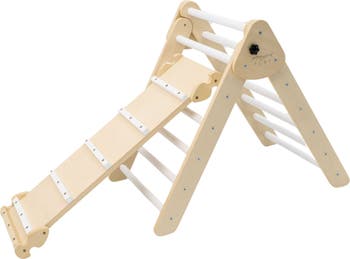 A foldable wooden climbing triangle with a reversible ramp that supports balance, coordination, and imaginative play in a safe, thoughtfully designed setup. This Pikler-inspired climbing triangle invites little ones to explore movement at their own pace while building confidence, coordination, and body awareness through active play. Crafted from wood and designed for stability, the climbing triangle supports balance control and motor skill development in a safe, open-ended environment. The included long ramp adds versatility, featuring a smooth slide on one side and a climbing ladder on the other for varied play experiences. Designed to grow with your child, this set encourages imaginative play—from climbing and sliding to building bridges and forts. The triangle folds easily for convenient storage, making it a functional, space-conscious addition to modern homes.