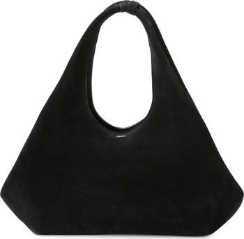 The brand's signature geometries come together in an elegantly playful way with this roomy suede bag that folds flat for filling and folds up tote with hand- or shoulder-carry options.