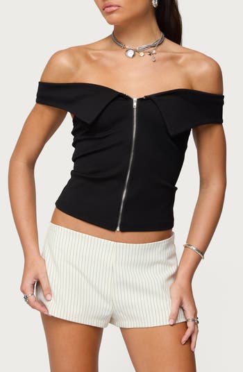 A flashy zipper highlights the midriff-baring design of this crop top complete with a foldover off-the-shoulder neckline.