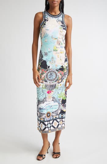 Cruise into warm weather in this hand-sewn jersey dress with Camilla's signature crystals set against the season's Folk Afloat print—a tribute to the vibrant beauty Portugal's coastline.