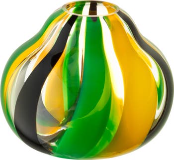 Bring stunning artisan craftsmanship to your living space with this mouth-blown glass vase featuring a curved shape and distinctive, Polish-folk-art-inspired stripes.
