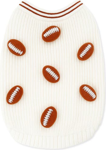 Three-dimensional appliqués of sporty footballs dot this warm and cozy ribbed sweater your pup will love on chilly days.