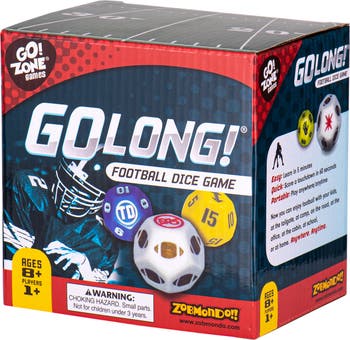 Go Long! is a 4-quarter football game where you roll the dice to march 100 yards down the field. Run, pass, or go long for a 100-yard touchdown! But beware, penalty flags, sacks, and turnovers will come between you and the goalpost. This lightning-fast football dice game for kids is just as thrilling as a real game, with touchdowns, two-point conversions, and even field goals. Kids learn basic math concepts while having a blast, and adults will love playing it with them. The easy-to-learn rules make it appropriate for younger kids, and older kids will still like the engaging game play. The compact box game is also the perfect size for traveling, tailgating, taking on holiday visits, or just enjoying a night at the neighbors' house. This game is designed for ages 6 and up and for 2 players or 2 teams.