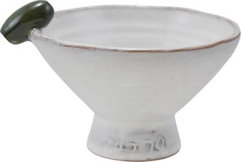 Add an earthy flourish to everyday settings with this Footed Stoneware Bowl, adorned with a three-dimensional olive perched gracefully on the rim. Its reactive glaze softly blends hues of white and green, giving each piece a distinct, handcrafted character. Whether nestled in a Farmhouse kitchen or styled in a Cottagecore nook, this bowl brings organic warmth and artisanal beauty to the table. Made of durable stoneware and finished with a glaze that allows natural color variation. Measures 4.75 inches in length, 4.25 inches in width, and 3 inches in height. A sweet and functional accent that celebrates simplicity and craft.