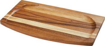 - This rustic serving tray features a solid wood silhouette with a raised edge in a natural finish