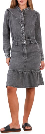 For A Stroll Ruffle Hem Long Sleeve Denim Dress