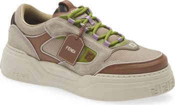 This low-top sneaker is crafted in Italy from beige mesh and mixed insets of suede with brown and green leather outlined by piping. The green laces are decorated with a removable full-grain-leather charm featuring the Fendi Roma logo and a customized snap hook.
