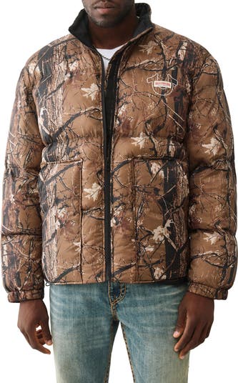 Stay warm while you stand out in this quilted puffer jacket patterned in bold forest camo and finished with a contrast logo on the chest. A stand collar and cinchable hem keep out the chill, while generously sized front pockets amp the utility.