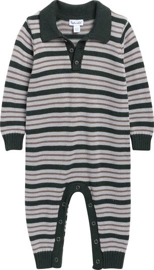 Sharpen baby's everyday style without sacrificing comfort with this striped knit romper tipped with a spread collar.