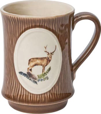 Hand-painted with a stately stag framed in earthy woodgrain, this creamy-ceramic mug adds a rustic touch to your favorite warm beverages.