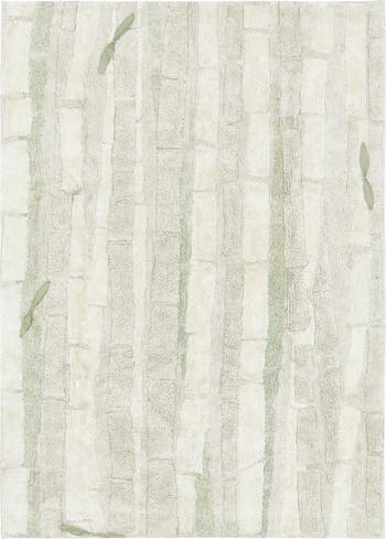 This softly shaded rug is a mix of cotton and rayon yarns and designed to simulate a forest of bamboo canes with high and low pile heights for soft structure. The five decorative bamboo leaves are made from organic cotton and are removable.