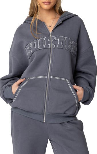 Raw edges and chunky topstitching add a DIY vibe to the appliqué logo that emblazons the front of this hoodie cut from a supersoft, cotton-rich knit that'll make this one a new go-to.