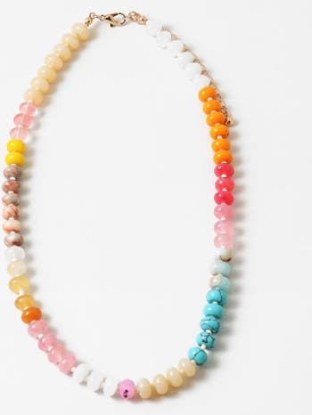 Brighten up any outfit with this stunning gemstone necklace, perfect for adding a pop of color to your everyday look or for making a bold statement on special occasions! Featuring a vibrant array of semi precious gemstones in hues of orange, turquoise, pinks and neutrals, this piece is a true celebration of color reminding each and everyone one of us that we are Forever Young and to live each day to the fullest!