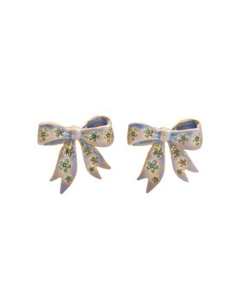 Add a sweet and vintage touch to your looks with these Forget-Me-Not Bow Stud Earrings. Hand-painted in soft blues and greens, the delicate bows rest on 22ct worn gold-plated brass studs, with engraved flowers adding a whimsical touch. These earrings are perfect for everyday wear or pairing with your favourite treasures.