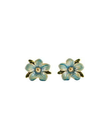 Opt for understated elegance with our Forget-Me-Not Flora Stud Earrings. Hand-painted aqua flowers with delicate green leaves rest gracefully on 22ct worn gold-plated brass studs, bringing a touch of elegance to your jewellery collection. Subtle yet enchanting, these earrings are a tender reminder of nature's delicate beauty.