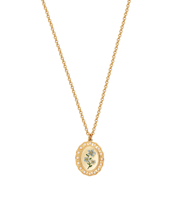 The Forget-Me-Not Pearl Cameo Necklace exudes elegance and is a token of devotion. Suspended from a fine 22ct worn gold-plated brass chain, the retro-inspired pendant blooms with hand-painted dusty blue flowers and delicate pearl embellishments. Engraved with Forget Me Not on the back, it is a reminder of love and devotion - a graceful treasure to wear alone or layered with your favourite pieces.
