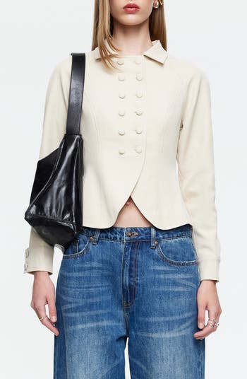 A sharp collar and raglan sleeves frame the double-breasted front of a lightweight jacket that's gently fitted at the waist and finished with a crossover cutaway hem.