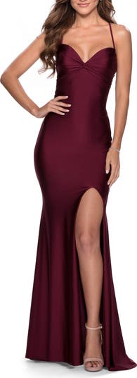 Sleek and elegant long jersey prom dress with ruched bow bodice detailing. Features a strappy tie up back and side leg slit. Back zipper closure.