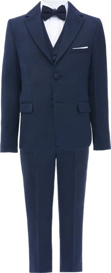 Elevate your young gentleman's wardrobe with this formal suit, tailored to perfection for special occasions. Featuring a structured blazer with a notched lapel, matching trousers, and a crisp white shirt complemented by a sleek bow tie.