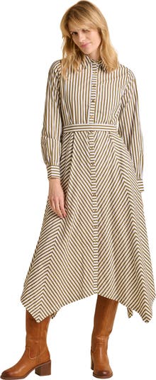 A refreshed take on the traditional striped midi, this dress offers a tailored style perfect for dressing up and down. Featuring a matching stripe wrap belt that cinches the waist - creating a dramatic flared skirt - and A shirt-inspired collar, cuffs, and tortoiseshell buttons, this dress is all about the details.