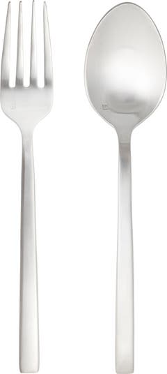 This contemporary serving set featuring a brushed finish and square handles is made from high-grade stainless steel, resulting in a balanced handfeel.