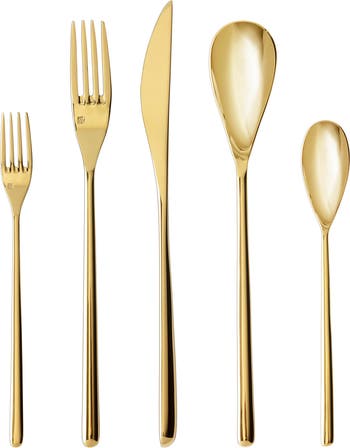 Every meal is an elegant affair with the smoothly sculpted lines of this golden-finish flatware set crafted for precision and balance from stainless steel.