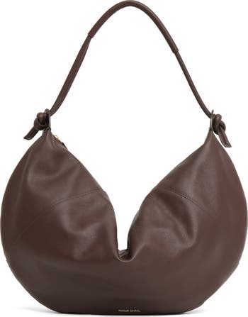 Modeled after the artful folds of fortune cookies, a slouchy crescent shape defines this soft Italian-calfskin bag complete with a knot-secured shoulder strap.