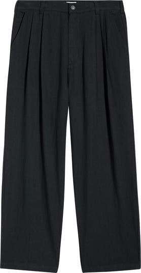 Crisp knife pleats bring old-school detailing plus a bit of extra room to pants cut from a fluid linen blend in a profile that sits above the hips with a relaxed fit in the seat and thighs. They're versatile enough to kick up your everyday wardrobe or add a smart finish to any elevated-casual look.