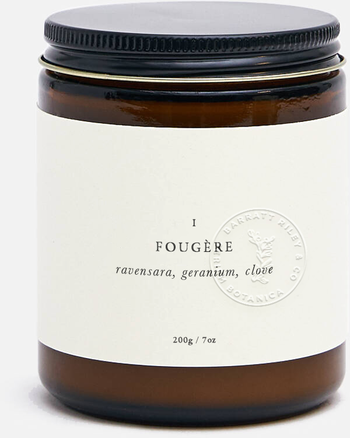 Botanical candle composed of natural coconut wax infused with pure botanical extracts. "Fougère" is one of Barratt Riley's very first aromatic formulations, a carefully crafted recipe made with more than ten different botanicals. Its scent journey begins with ravensara and lemon, which bring a fresh and almost medicinal clarity, offering an uplifting and healing quality to the air. Heart notes of geranium and lavender emerge, a floral sweetness that feels light and airy, with a calming, herbal touch that soothes the senses. Earthy patchouli deepens the experience, creating a grounding effect that lingers in the background. Finally, base notes of clove and cedarwood bring a rich and spicy complexity while adding depth and strength — a woody, resinous foundation, grounding the blend in a soothing and comforting embrace.