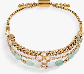 Wear symbols of luck with this Stranded Four-Leaf Clover Bracelet Set, which features three bracelet strands. One has an in-line charm with a White Jade four-leaf clover with cubic zirconia accents on a chain bracelet, one is a chunky herringbone chain bracelet, and one has semi-precious Green Aventurine beads. White Jade is a stone of positivity, Green Aventurine is said to promote optimism. The Stranded Collection features an all-new, interchangeable design. Bracelet strands attach to an adjustable length keeper, included with the set. Swap out strands from different pieces and combine them to make a style that’s all your own.