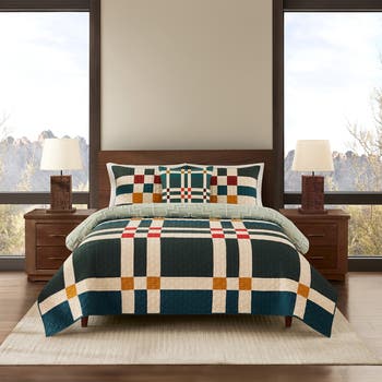 Give your bedroom retreat a geometric makeover with this lightly quilted set made from soft cotton patterned in colors that feel natural and balanced.