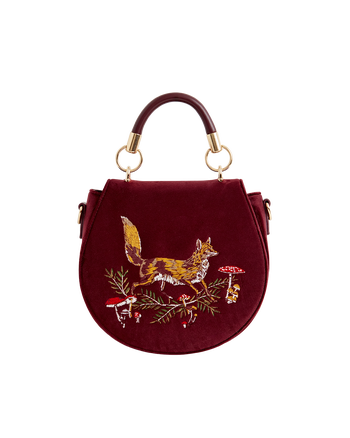 Discover the allure of nature's secrets with our Fox & Mushroom Embroidered Saddle Bag in Redcurrent Velvet. Crafted from sumptuous redcurrent velvet, this bag features a rounded, saddle-shaped silhouette adorned with detailed embroidery depicting a detailed embroidery of fox amongst mushrooms capturing the delicate equilibrium between cunning intelligence and the enigmatic wonders of the natural world. Designed for both beauty and functionality, the bag comes complete with a top handle for easy carrying and an adjustable cross-body strap for hands-free convenience. As you carry this bag, you carry a piece of hidden wisdom that thrives within the forest's enchanting realm.