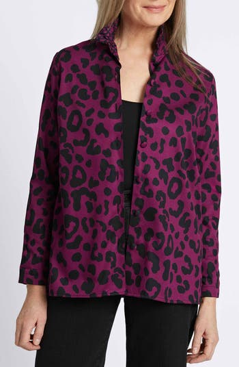 Timeless animal spots decorate this crisp cotton-sateen shirt that's popped with handy pockets and topped with a fanciful frilly collar.