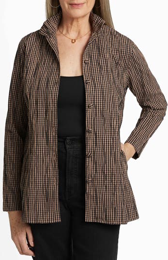 Cheery gingham plays well with a casually crinkled texture in this versatile, cotton-forward shirt-jacket closed with covered buttons.
