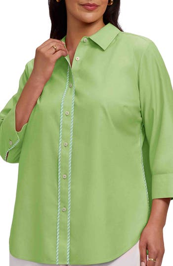 A polished work-to-weekend shirt is cut from lightweight cotton and accented with lively trim.