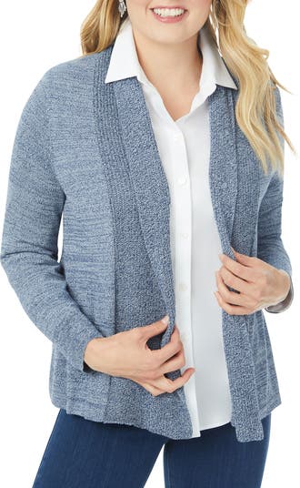 Mixed stitches knit from soft cotton-blend yarns add subtle interest to this light cardigan that layers easily over casual and more styled-up looks.