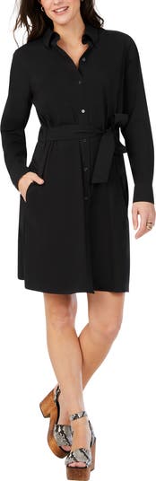 A long-sleeve shirtdress cut from comfortable stretch cotton cinches with an attached tie belt for a flattering fit.