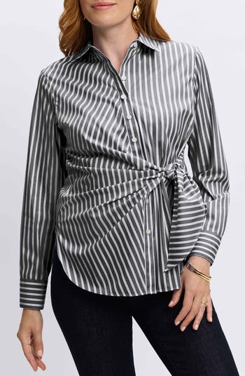 A graceful side tie provides shaping and an unexpected twist to a curved-hem shirt made from a stretch-added cotton blend fabric with energetic stripes.