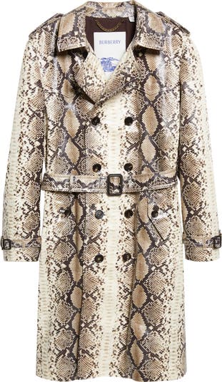 Inspired by an archival Burberry coat from the 1970s, the Foxfield trench is defined by a slim fit and pointed yoke. Debuted on the Summer 2026 runway, the snakeskin-patterned style features a wet‑look coated finish. The structured silhouette is detailed with the Equestrian Knight Design in antiqued metal.