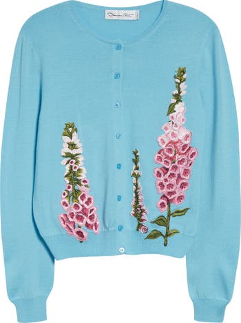 The season's favored flower—the bell-shaped foxglove—springs forth against a sky-blue canvas on this trim virgin wool cardigan that celebrates both the brand's devotion to botanical artistry and the beauty of nature in bloom.