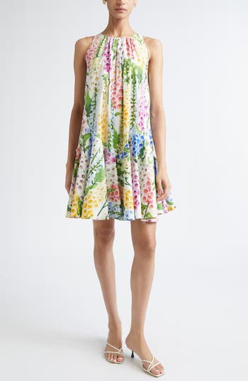 With its voluminous silhouette brought to life in a vibrant foxglove print, this sleeveless cotton poplin trapeze dress flows with ease. Soft pleating at the neckline enhances its airy movement, while hidden pockets add a touch of modern practicality to its painterly charm.
