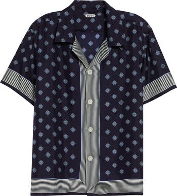 This retro-style shirt features a silk foulard print with a striped border developed from a 1930s cravat owned by American Broadway composer Moose Charlap.