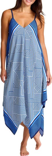 Go from the beach to dinner in this billowy midi dress with handkerchief-style hem and eye-catching geometric pattern.