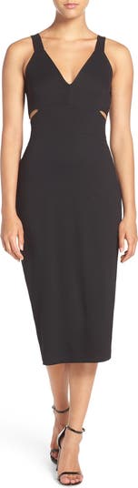 Sleek cutouts at the sides enhance the sultry appeal of a daring yet sophisticated midi dress cut with a slit at the center back hemline.